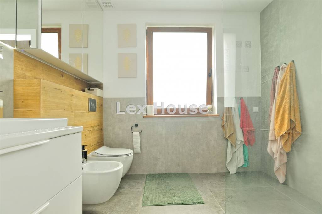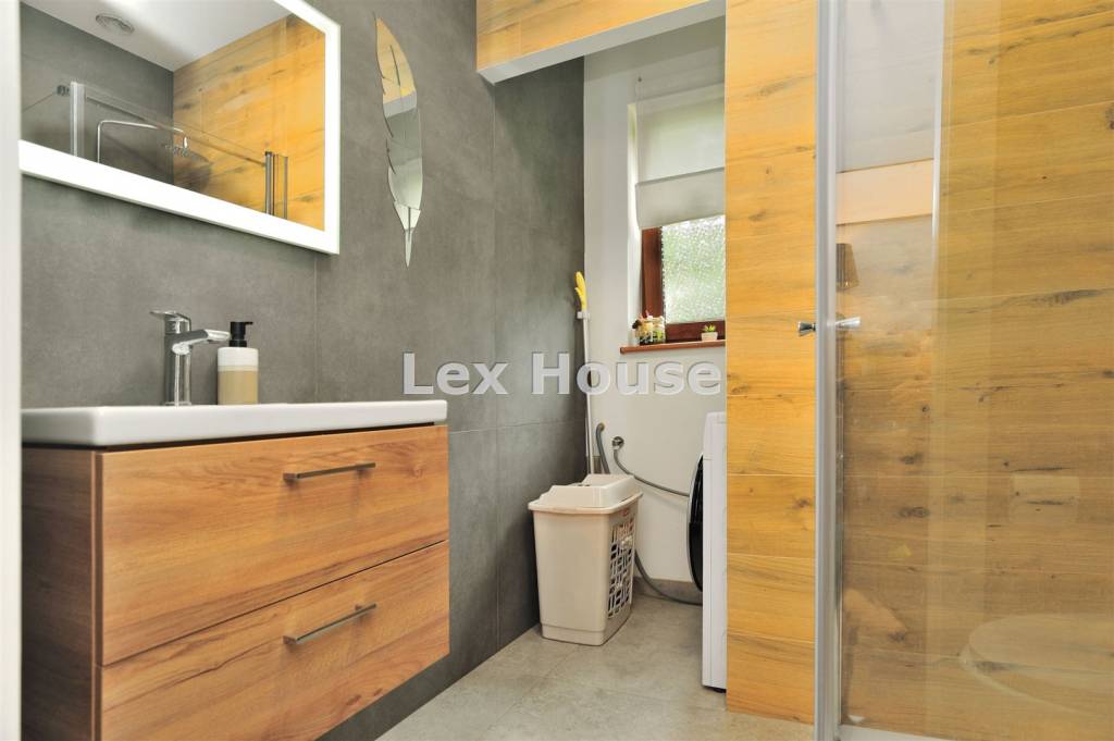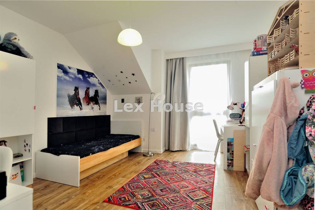 Piętro : główna sypialnia, pokój dziecięcy, pokój gościnny, gabinet, przedpokój oraz łazienka, wyposażona w prysznic i kabinę typu walk- in, która zapewnia idealne warunki do relaksu.