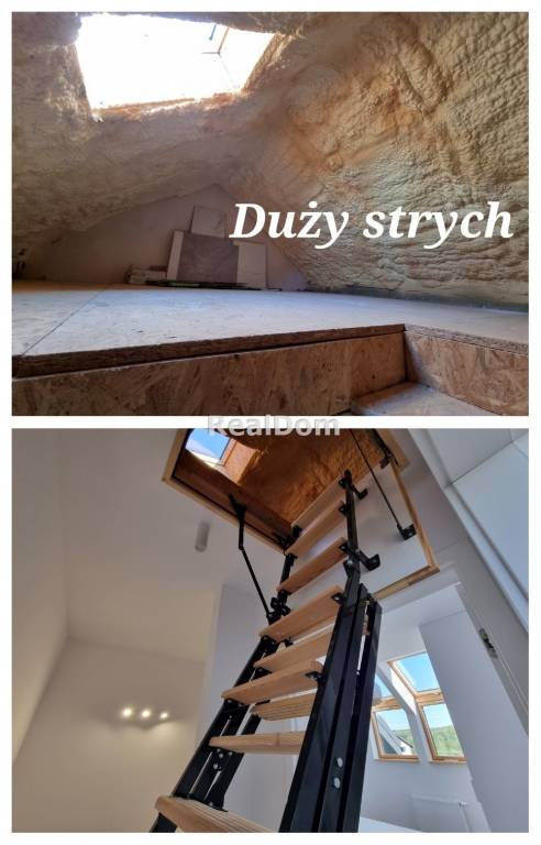 Piętro: dwie sypialnie (jedna duża połączona z dwóch pokoi), przestronna łazienka z oknem