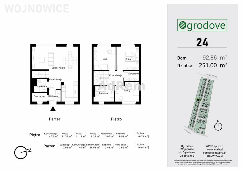 każdy z budynków ma powierzchnię użytkową 92,6 m 2 , różnią się powierzchniami działek ( od 251m 2 do ok 400m 2 powierzchni działki ) oraz usytuowaniem względem stron świata .