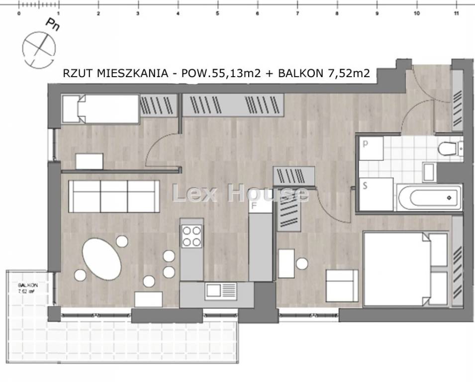Na powierzchnię 55,13 m2 składają się salon z aneksem kuchennym, dwie sypialnie, łazienka (6,2m2) oraz ciąg komunikacyjny.