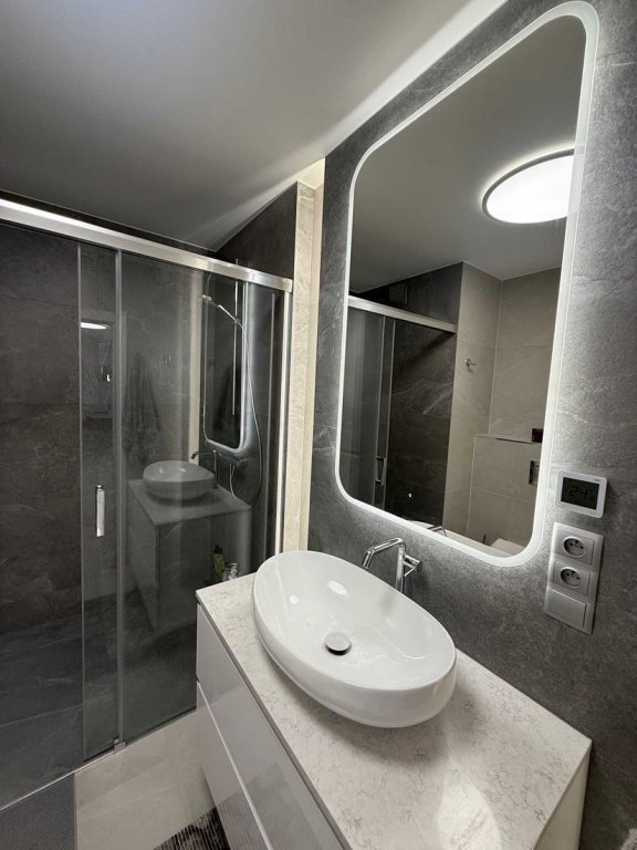 -Stylowa łazienka wykończona materiałami premium, blat z konglomeratu, kabina prysznicowa z drzwiami przesuwnymi.