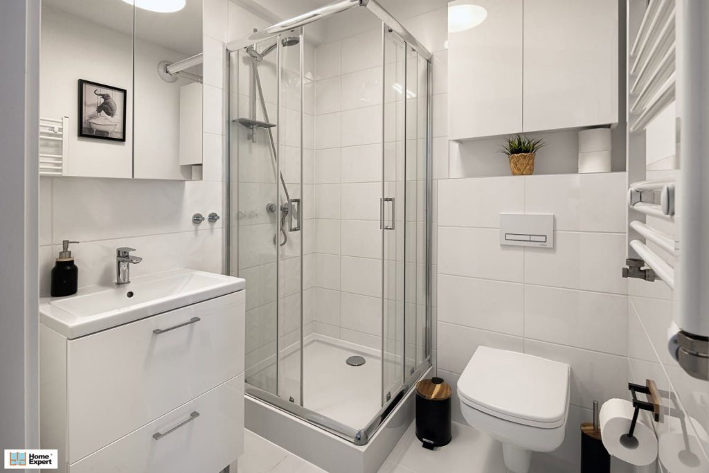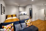 Składa się z salonu z aneksem kuchennym, części sypialnianej, stołu jadalnianego oraz eleganckiej łazienki z prysznicem i pralką.