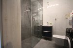 Wnętrze mieszkania wykończone jest z dbałością o szczegóły – na podłogach w pokojach położone są panele, natomiast w przedpokoju, salonie, kuchni oraz łazience znajdują się płytki. Salon zdobi beton architektoniczny, a dodatkowo zamontowana klimatyzacja zapewnia komfort przez cały rok. Z salonu prowadzi wyjście na prywatny ogród o powierzchni 207 m², który stwarza idealne warunki do relaksu i spędzania czasu na świeżym powietrzu. Dodatkowe ogrodzenie zapewnia intymność i komfort.