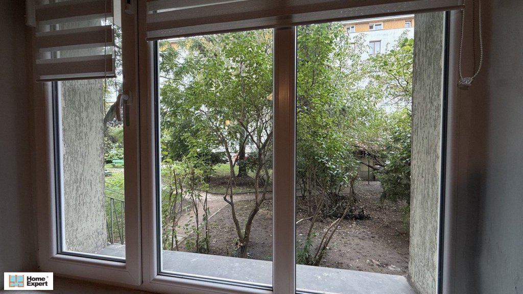 Mieszkanie jest na wysokim parterze, za oknem jest zielone podwórko.