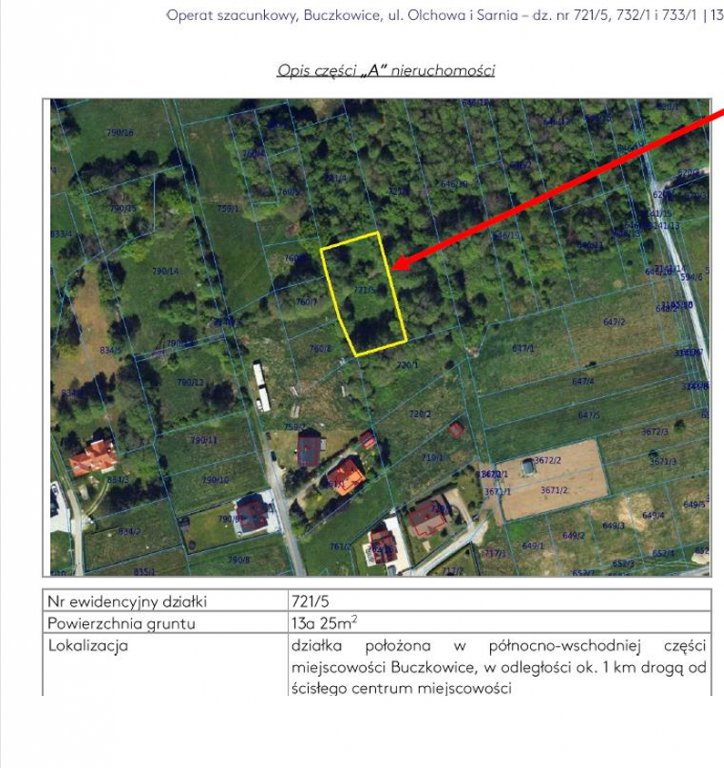Prawo własności udziału w wysokości 1/2 cz. w prawie własności nieruchomości gruntowej oznaczonej jako dz. nr 721/5, 732/1 i 733/1 , obj. KW BB1B/00042057/7, o łącznej powierzchni 29a 99m2 położonej w Buczkowicach w rejonie ulic: Olchowej oraz Sarniej