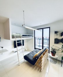 Antresola z miejscem do spania oświetleniem oraz gniazdkiem.
