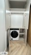 Kuchnia w zabudowie wyposażona w dużą lodówko-zamrażarkę, płytę indukcyjną, piekarnik, okap i zmywarkę, pralko suszarkę.