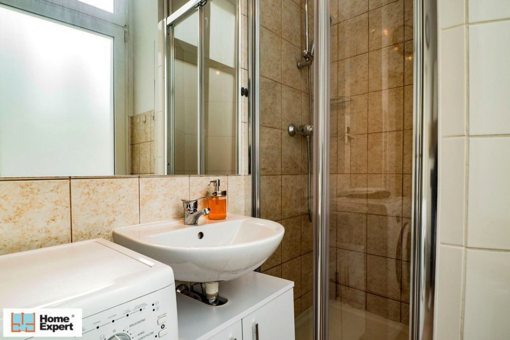 - Łazienka z WC – prysznic, pralka, umywalka, szafki, lustro