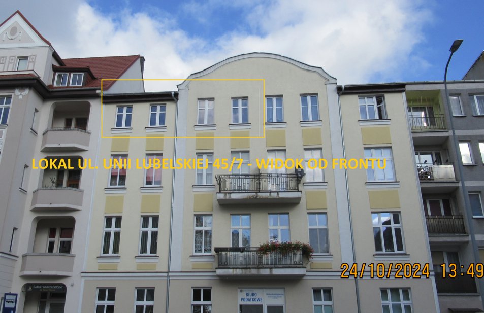 Lokal mieszkalny nr 7 położony w budynku przy ul. Unii Lubelskiej 45 o powierzchni użytkowej 102,8 m2 wraz z udziałem do 1473/10000 części w działce gruntu i we współwłasności części wspólnych budynku i jego urządzeń, które nie służą wyłącznie do użytku właścicieli lokali.