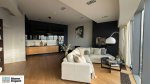 1. Salon z aneksem kuchennym: Przestronny, doświetlony panoramicznymi oknami. Kuchnia w eleganckiej, czarnej zabudowie z frontami na wysoki połysk, w pełni wyposażona w sprzęt AGD klasy premium.