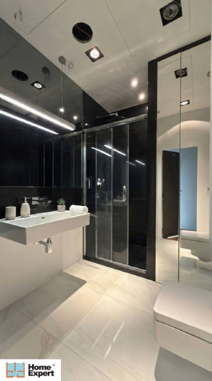 3. Łazienka: Nowoczesny pokój kąpielowy wykończony spiekami kwarcowymi, wyposażony w dużą kabinę prysznicową typu walk-in.