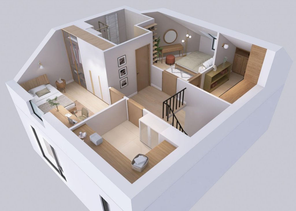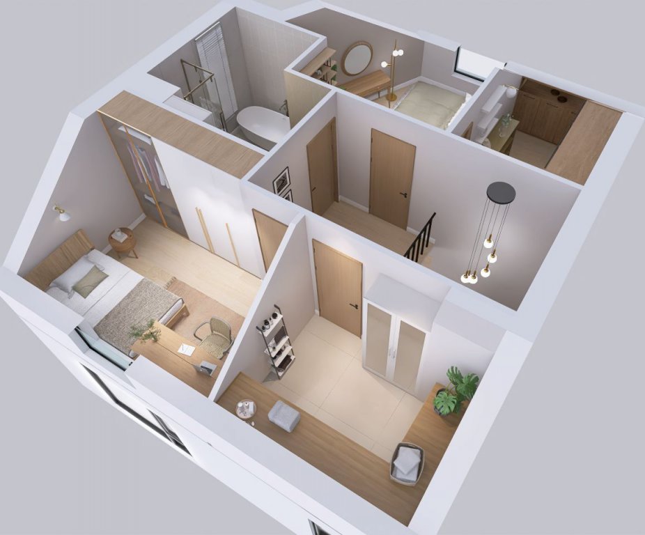 -przestrzeń do własnej aranżacji – możliwość wydzielenia dużej łazienki, przestronnej sypialni z garderobą, pokoju/biura, pralni, garderoby – według indywidualnych potrzeb.