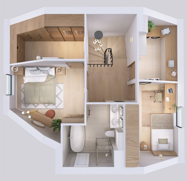 • Dwupoziomowe mieszkanie z funkcjonalnym podziałem: