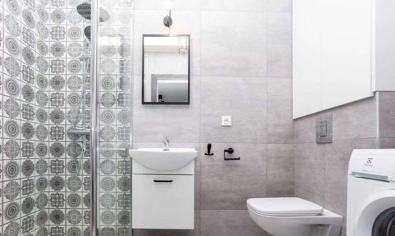 Łazienka: kabina prysznicowa z deszczownicą, lustro, pralka, umywalka z szafką, toaleta, szafka na kosmetyki
