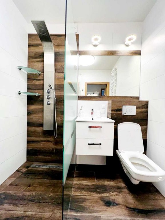 2 pokoje, kuchnia, łazienka z prysznicem, przedpokój z szafą lustrzaną.