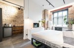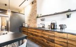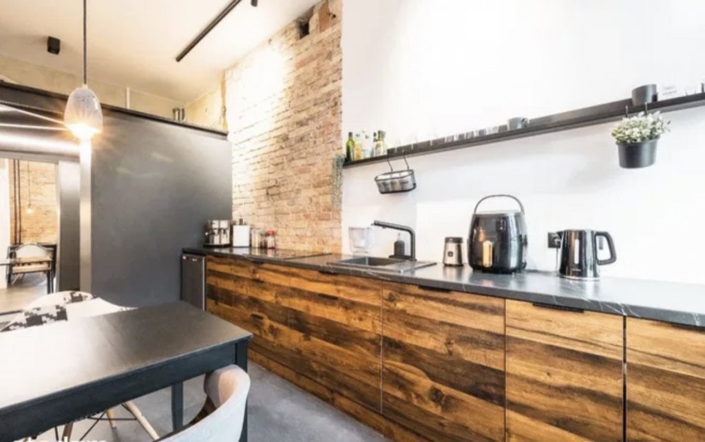 Przestronna kuchnia z wykończeniami z naturalnego drewna i nowoczesnymi urządzeniami AGD. Ściany z odsłoniętą cegłą nadają wnętrzu industrialny klimat, który idealnie współgra z minimalistycznym wykończeniem. Duża ilość miejsca do przechowywania oraz wygodne blaty robocze sprawiają, że kuchnia jest zarówno funkcjonalna, jak i estetyczna.
